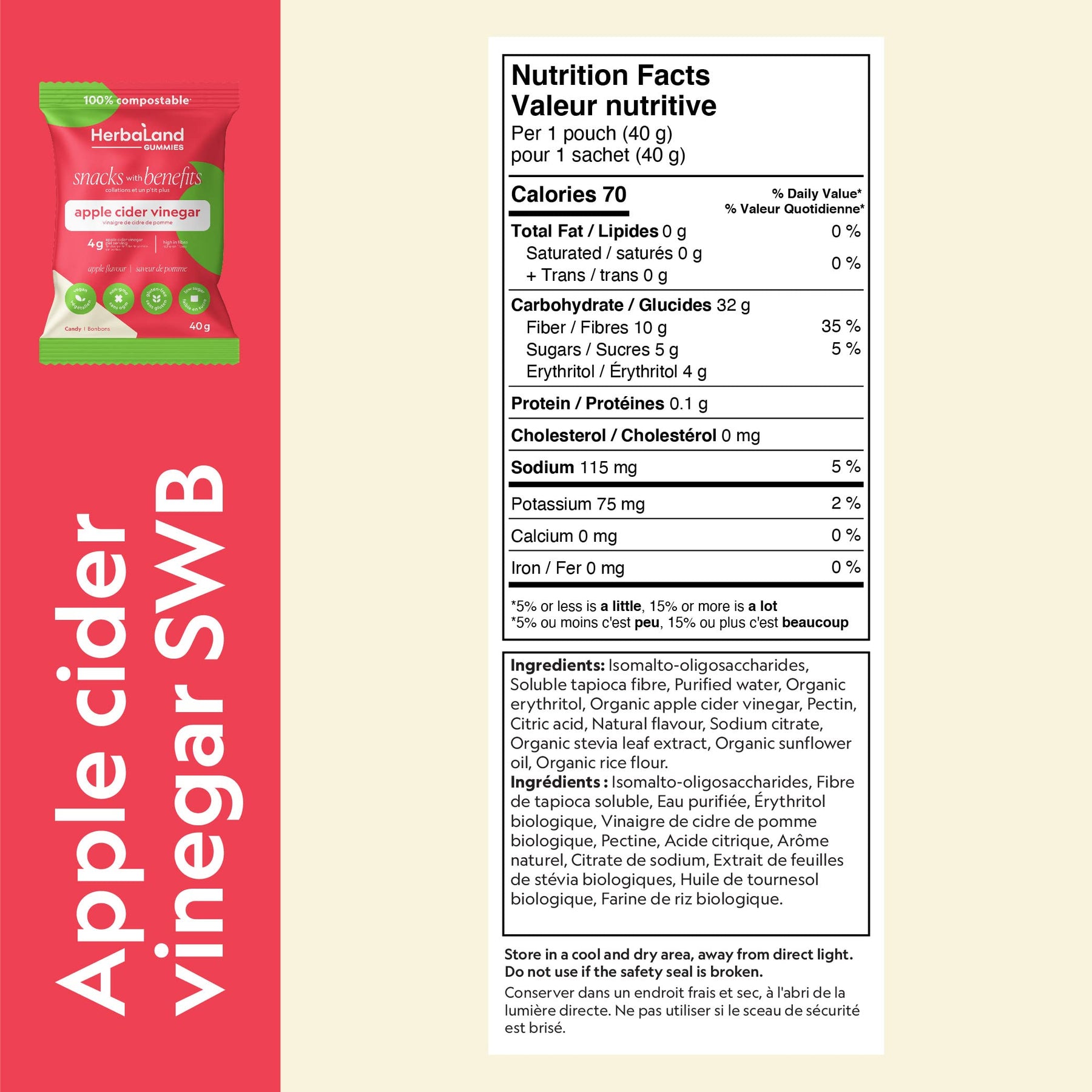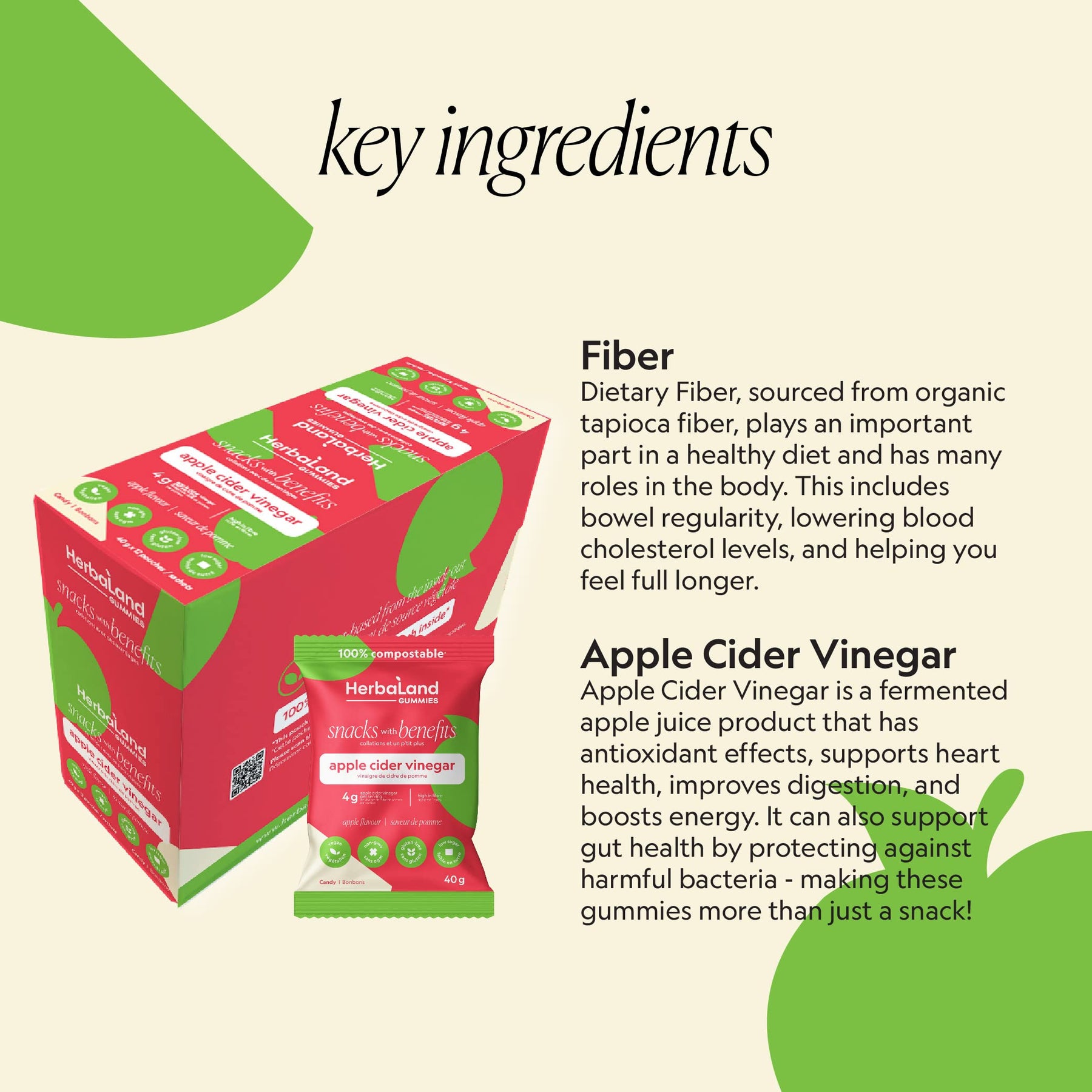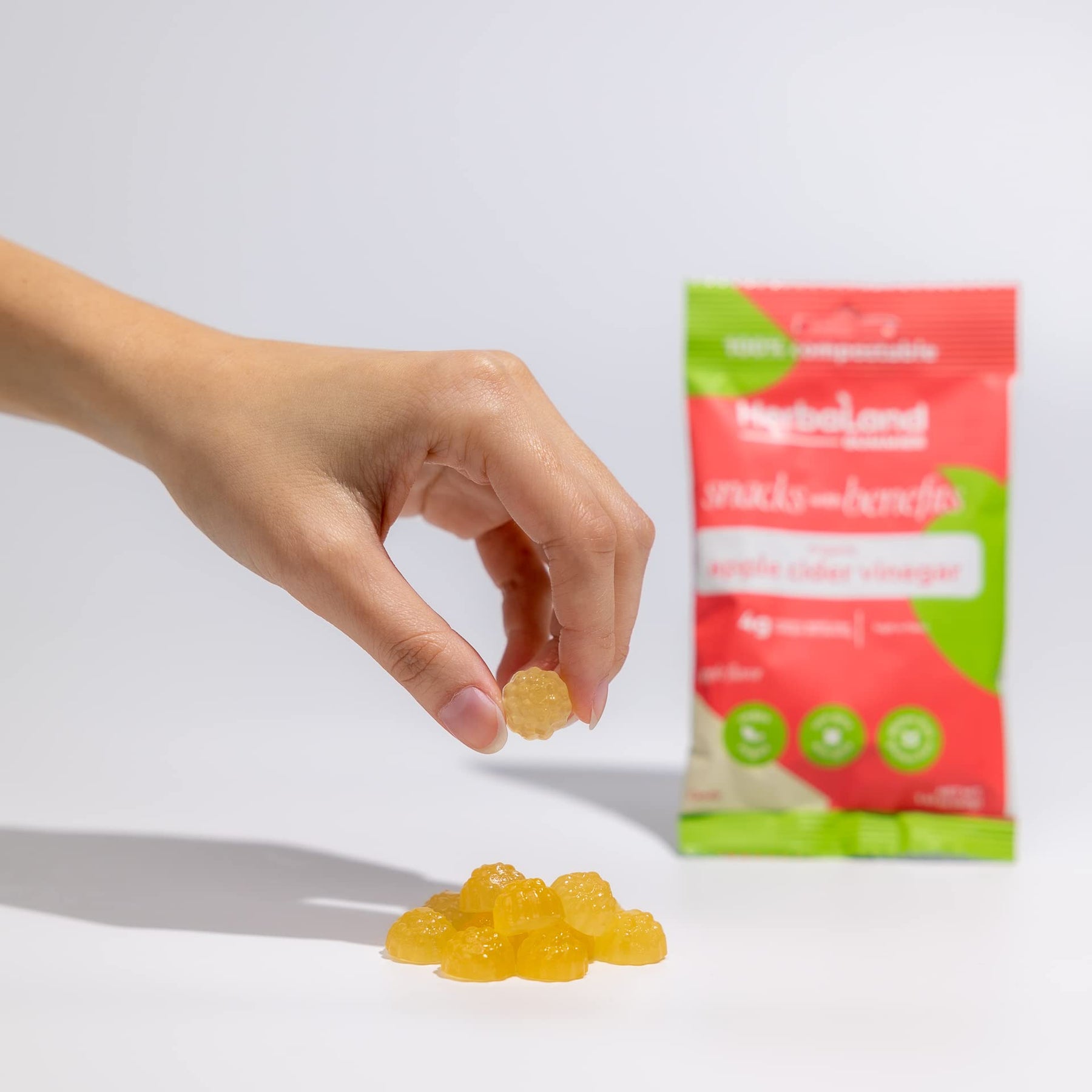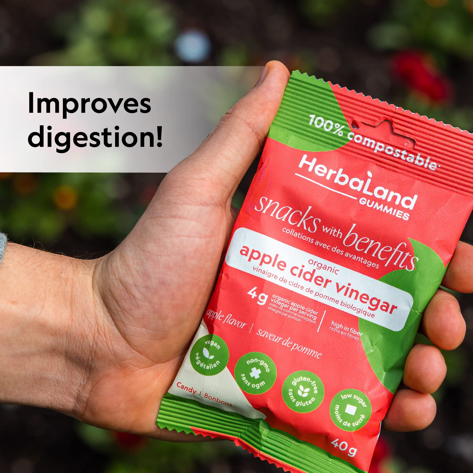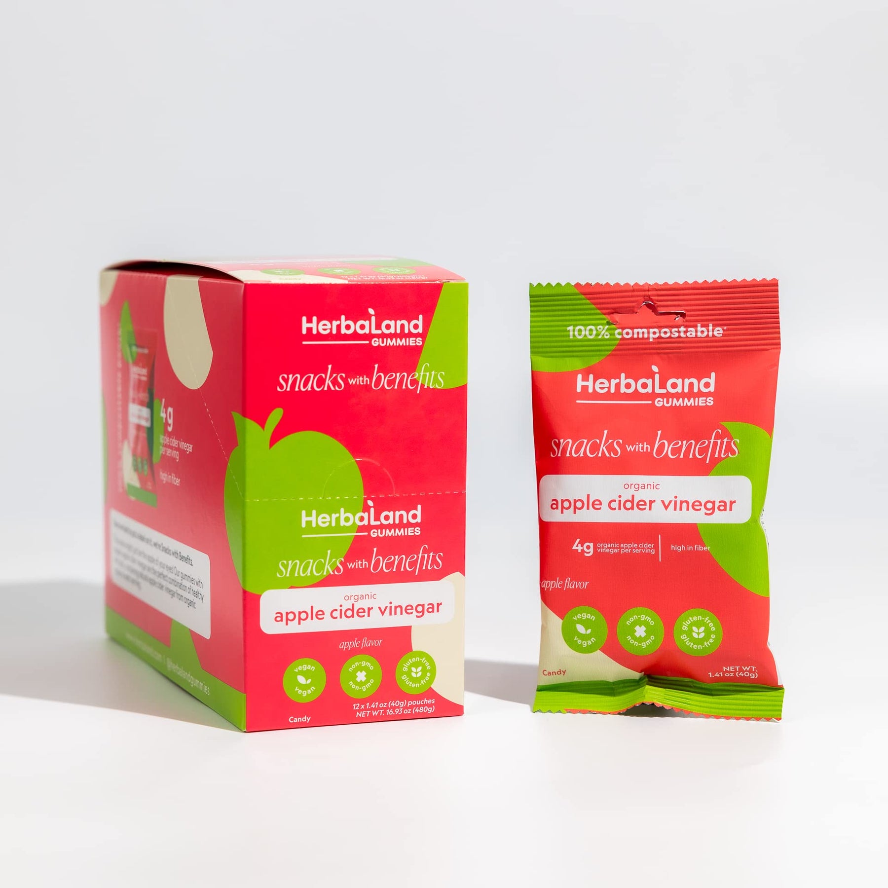 Herbaland Apple Cider Vinegar Gummies – Snacks with Benefits – Vegan, Low-Sugar, High-Fiber, Gluten-Free, 4g of Organic Apple Cider Vinegar & 10g of Organic Tapioca Fiber Per Pouch – Apple Flavor, 12 x 40g (Box of 12), Compostable Pouch