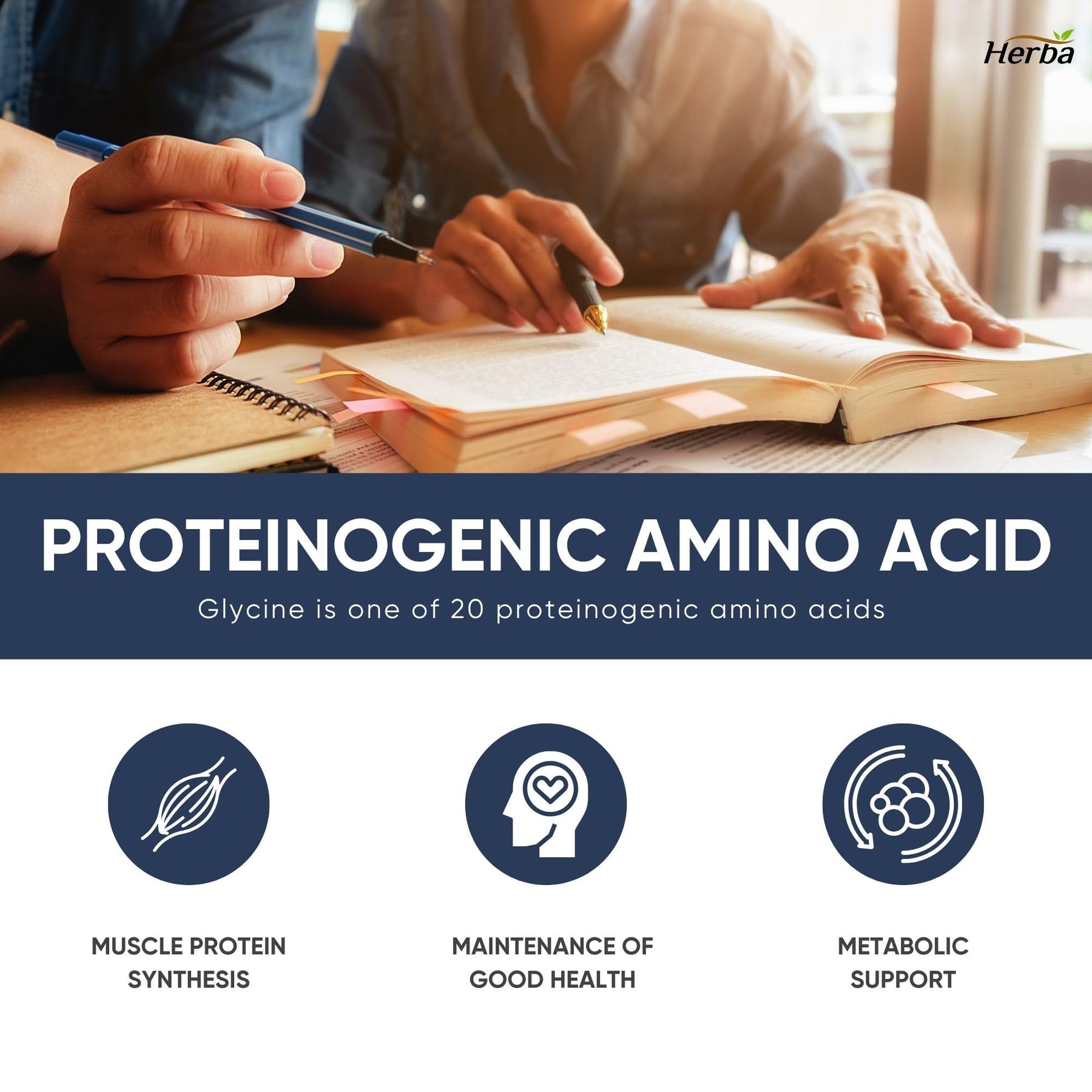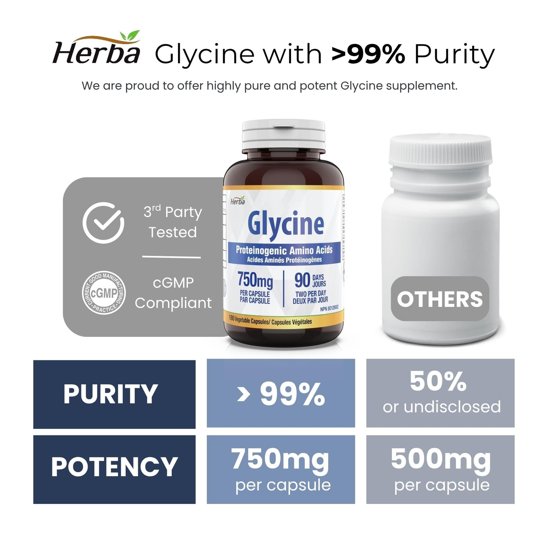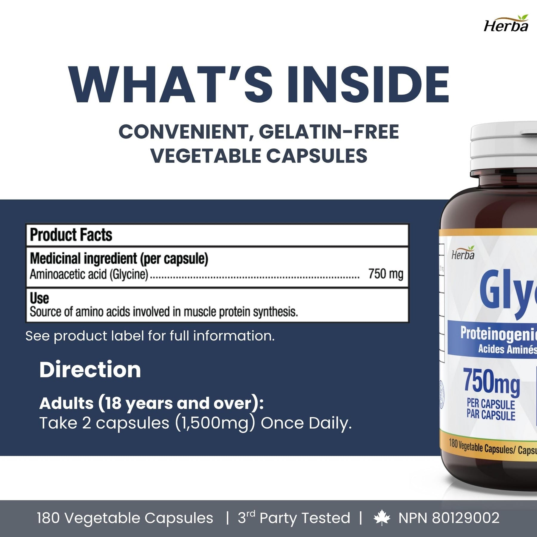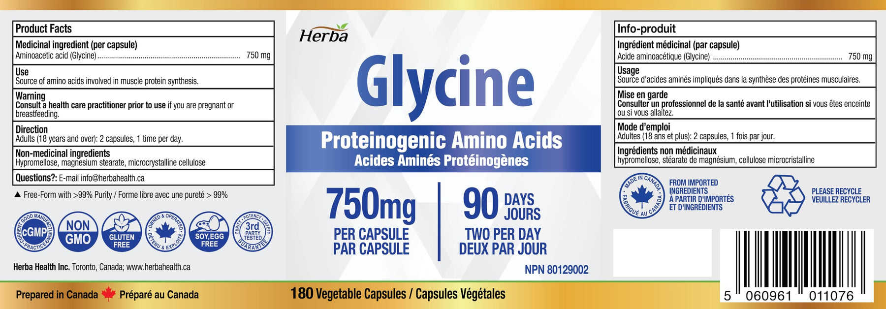 Herba Glycine Supplement 750mg - 180 Capsules | >99% Ultra Pure Glycine Capsules | Free-form Proteinogenic Amino Acids Supplements | Made in Canada