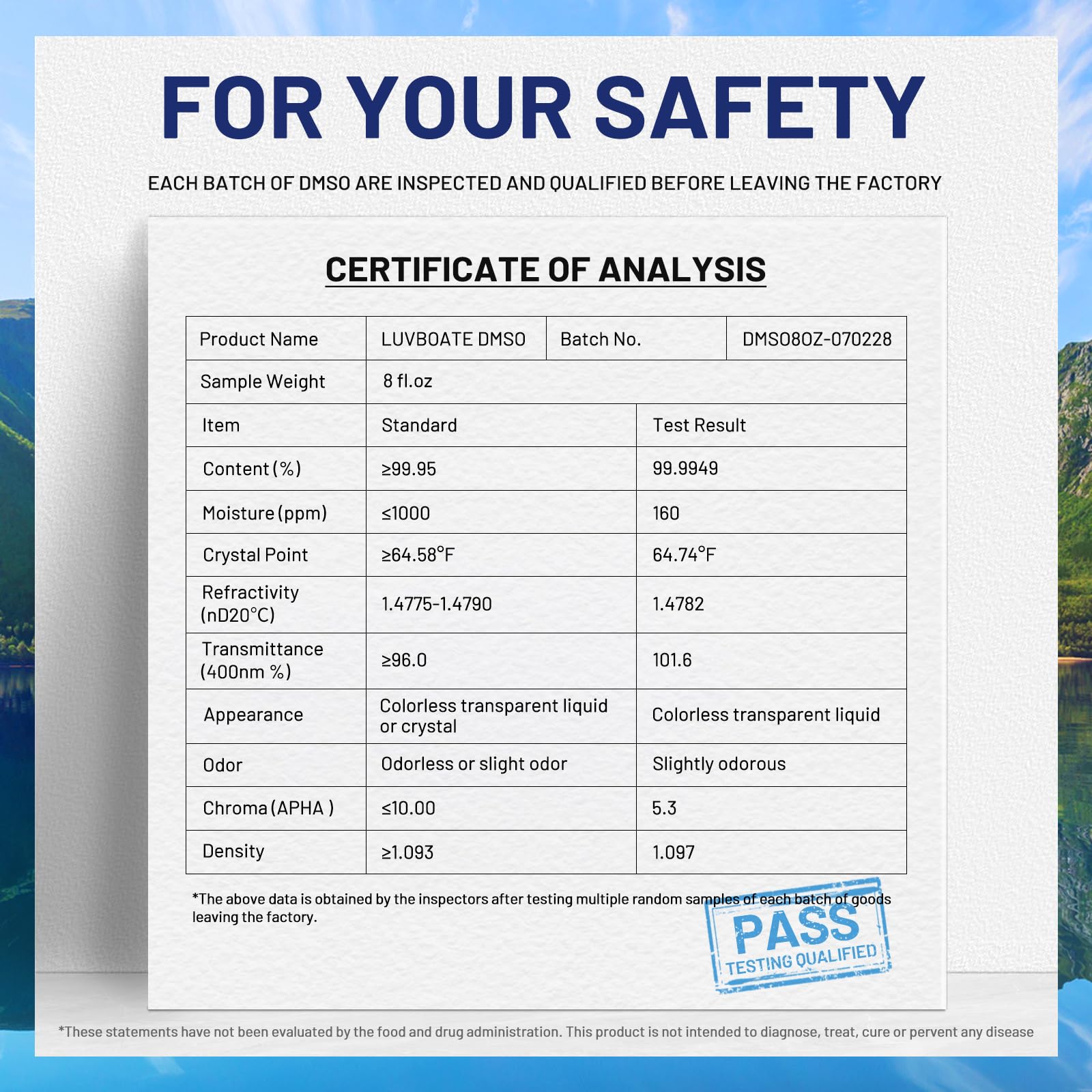 - QUALITY AND SAFE PACKAGING – All our products are bottled in amber glass bottles to prevent damage from sunlight. The Glass Bottle is manufactured under strict practices to safeguard against impurities and provide a strong, safe storage for the concentrated Dimethyl Sulfoxide solution.