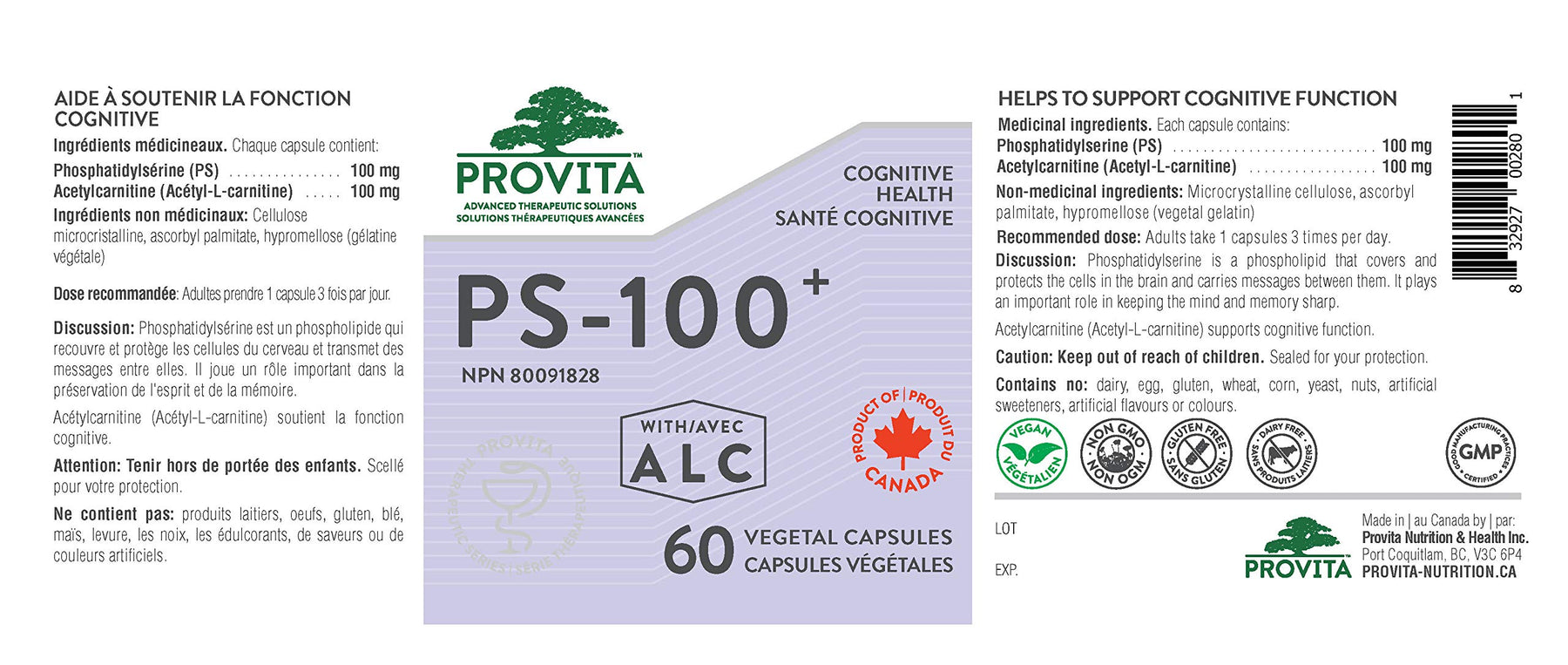 <p>Provita PS-100+ ALC vegan capsules offer an advanced solution for those seeking to sharpen their mental acuity. Each capsule brings together 100 mg of Phosphatidylserine and 100 mg of Acetyl-L-Carnitine, two components valued for their role in supporting excellent brain performance. This product is thoughtfully designed to nurture cognitive abilities and strengthen recall, making it an excellent choice for daily mental activities and maintaining intellectual sharpness. Crafted with care in Canada, it contains no GMOs, artificial sweeteners, or common irritants, ensuring it fits seamlessly into various lifestyles, including vegan and those with sensitivities.</p> <p>Incorporating Provita PS-100+ ALC capsules into your daily routine provides beneficial elements that help manage mental tiredness and uphold memory capabilities. Many users report enhanced recollection and information retention, leading to greater effectiveness and a more attentive approach to tasks. This supplement is simple to add to your daily life, supplying valuable elements that promote a mental advantage without changing your regular eating habits. You can rely on the careful formulation from Provita to support vibrant brain activity and mental energy.</p> <p>With its focus on enhancing mental clarity and providing robust brain assistance, Provita PS-100+ meets the desire for effective memory aids. The combined contributions of Phosphatidylserine and Acetyl-L-Carnitine have been appreciated by individuals looking to boost focus and mental well-being without compromise. Choose a supplement that aligns with your thoughtful lifestyle, ensuring a supportive and effective way to enhance cognitive function and memory. Experience the positive impact Provita PS-100+ can have on your mental capabilities and become part of a community that prioritizes brain well-being today.</p>