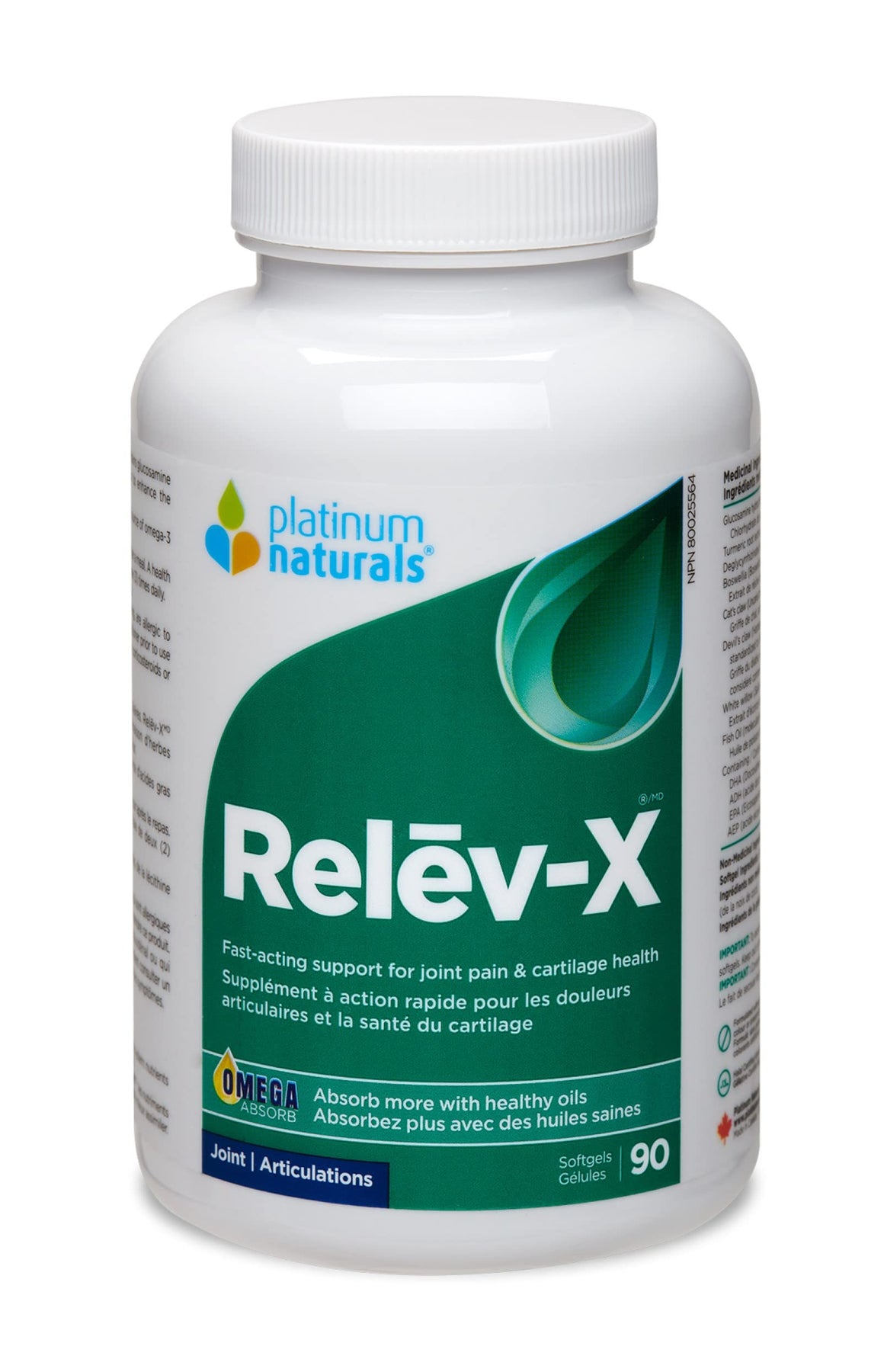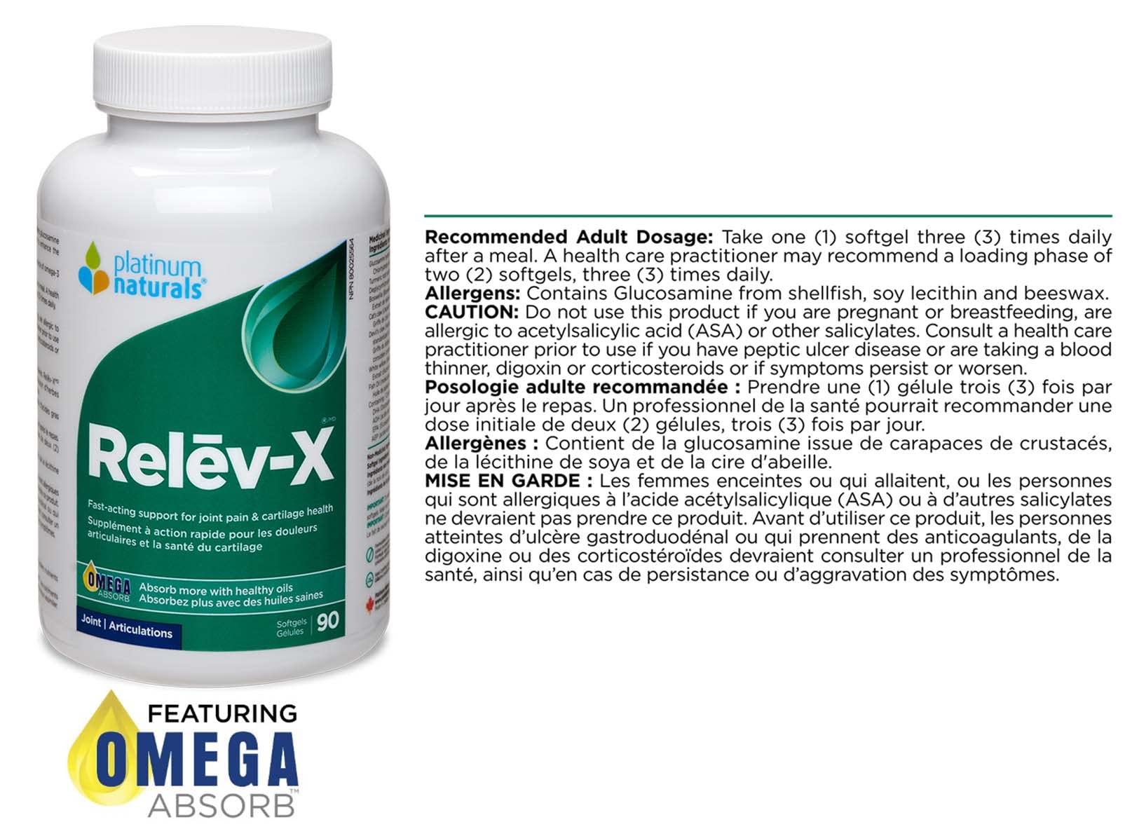 - COMPREHENSIVE JOINT SUPPORT - Platinum Naturals Relev-X is specially formulated to provide men and women with essential nutrients for joint health, including a blend of omega-3 fish oil capsules, glucosamine, and turmeric supplements to support joint flexibility and comfort.