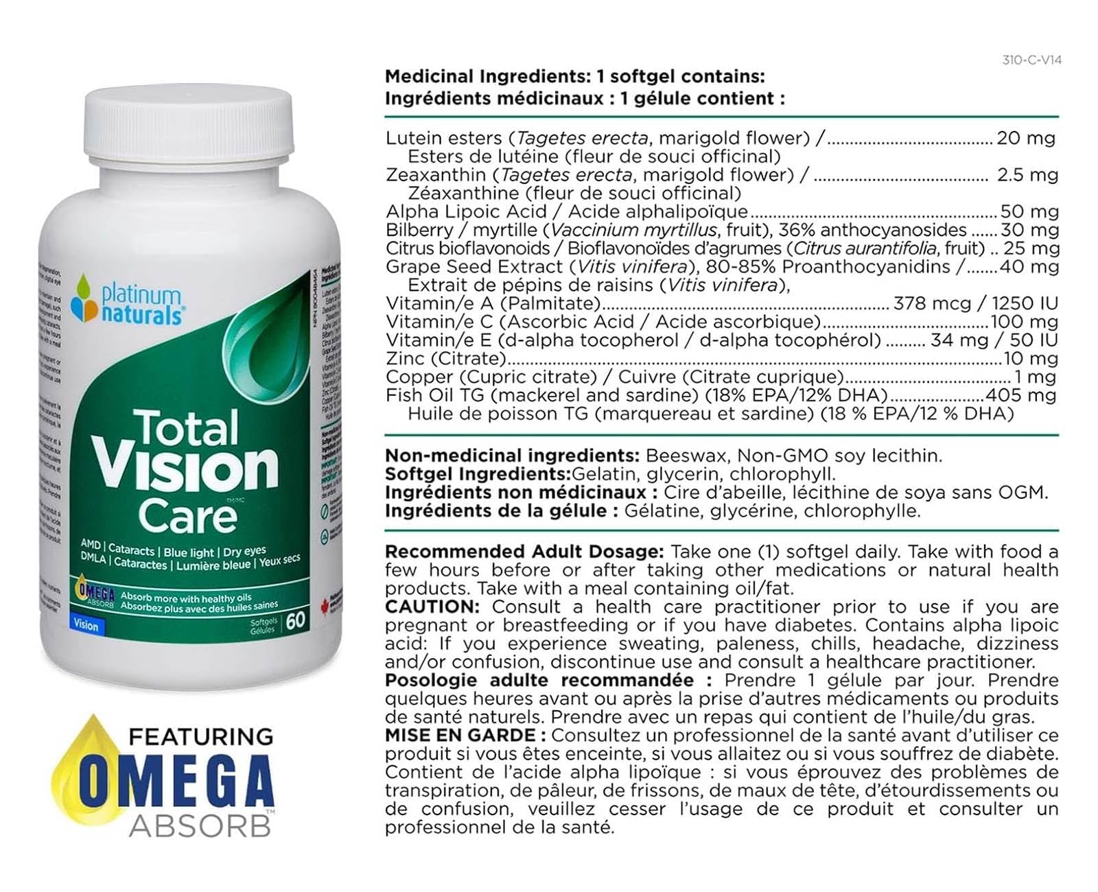 - COMPREHENSIVE EYE SUPPORT - Platinum Naturals Total Vision Care is formulated with a blend of Omega 3 fish oil, lutein, and zeaxanthin, intended to promote optimal eye function.