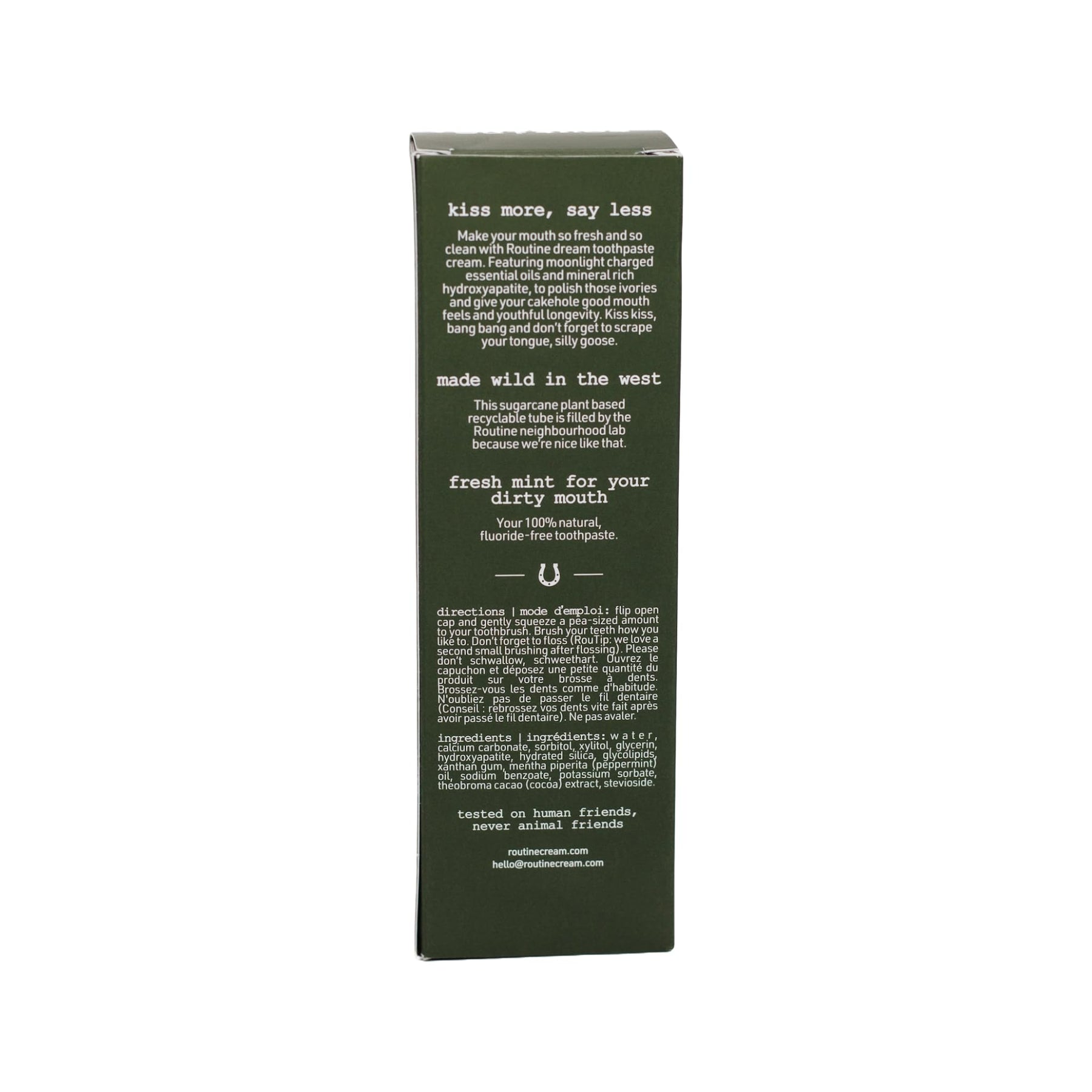 KISS MORE, SAY LESS Fresh mint for your dirty mouth. Make your mouth so fresh and so clean with Routine toothpaste cream. Kiss kiss, bang bang and don't forget to scrape your tongue silly goose. Featuring moonlight charged essential oils and mineral rich hydroxyapatite, to polish those ivories and give your cakehole good mouth feels and youthful longevity.