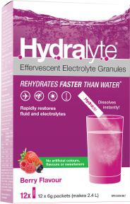 Rapidly rehydrate with Hydralyte Electrolyte Powder Sticks! These clinically formulated electrolyte powders are designed to help manage dehydration by quickly replenishing lost electrolytes. Convenient and portable, Hydralyte's Electrolyte Powder Sticks instantly dissolve to make a hypotonic electrolyte solution. Hydralyte is clinically formulated to contain the correct balance of glucose and electrolytes for the prevention and relief of dehydration. All of the hydrating electrolyte drinks are based on the World Health Organization criteria for effective rehydration. Hydralyte works by replacing fluid and electrolytes lost due to vomiting, diarrhea, fever and heavy sweating. Dehydration can be the result of sickness such as colds or fever, heat exhaustion from sun and heat exposure, or physical exertion during vigorous exercise. The symptoms of dehydrations can include dizziness, nausea, a dry mouth or extreme thirst, confusion, and headaches including migraines. Hydralyte helps you manage dehydration symptoms, and is great to keep in your gym bag or travel carry-on for wherever your adventures take you.
