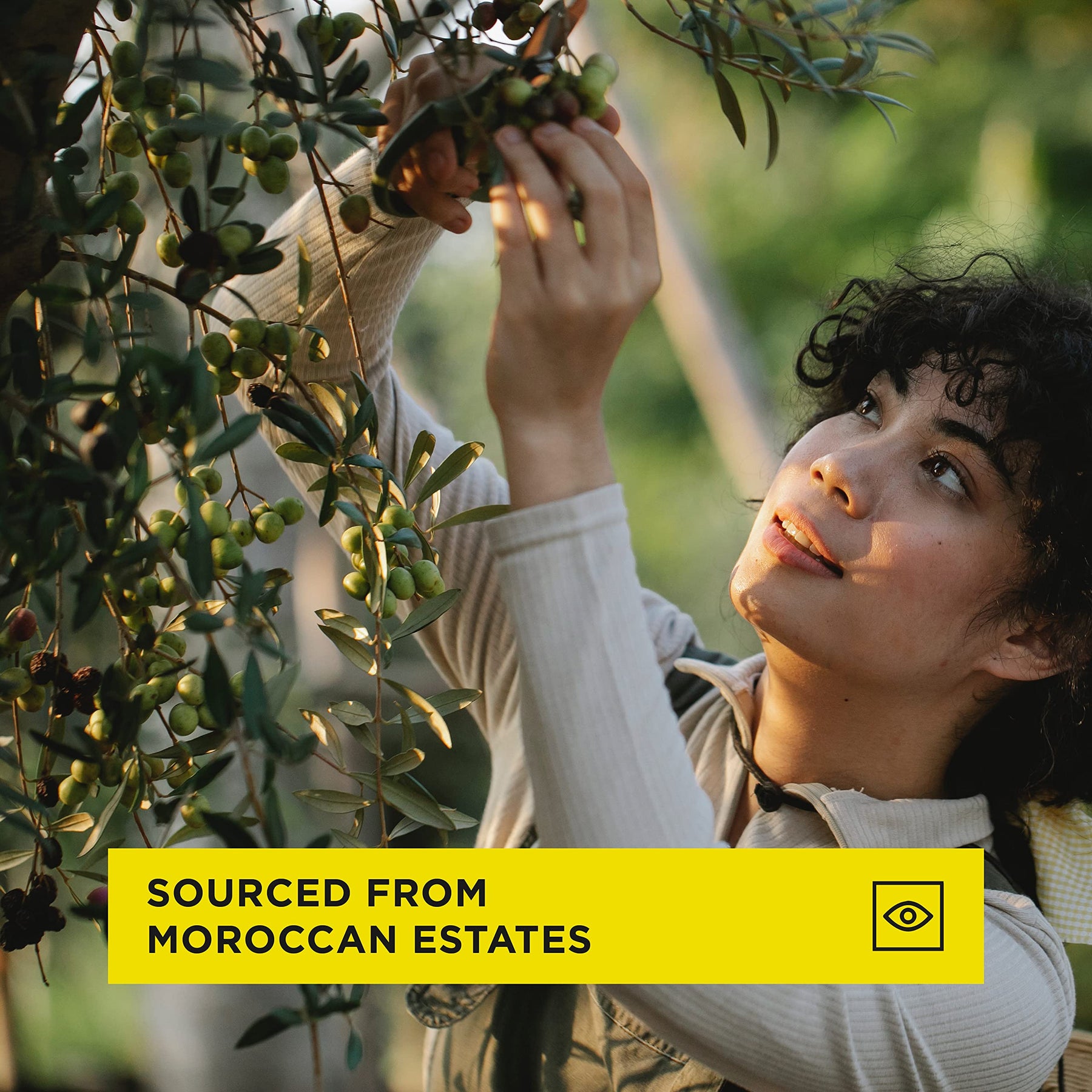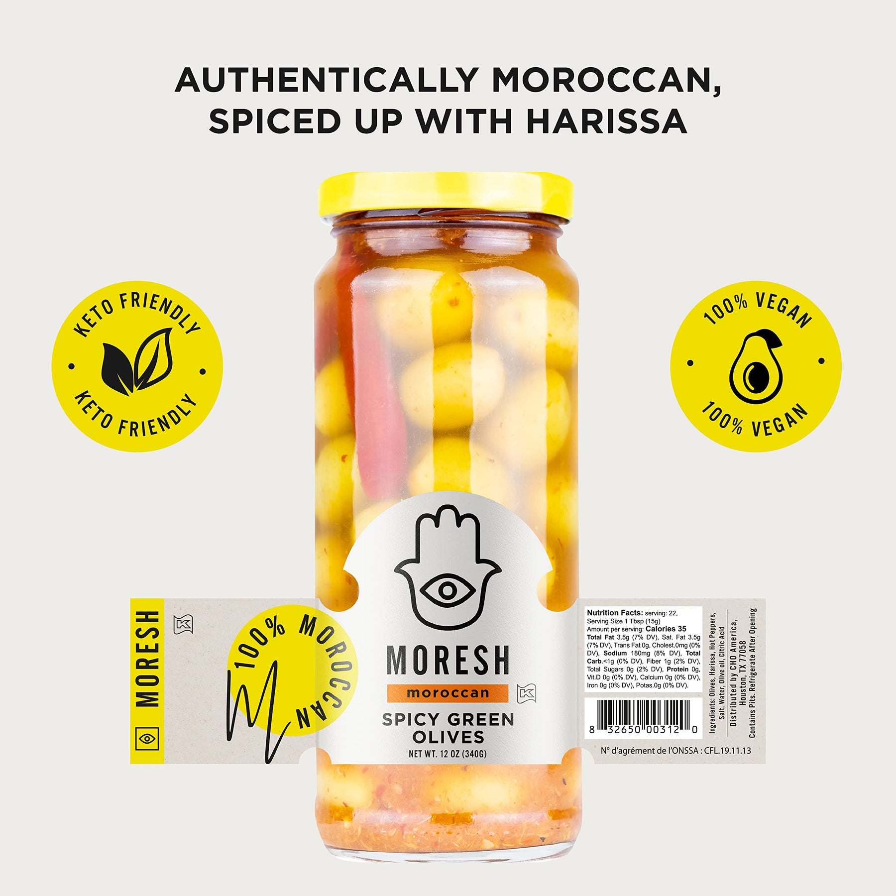 Spicy Green Olives. Moroccan Picholine olives, chili pepper, Harissa, and olive oil.