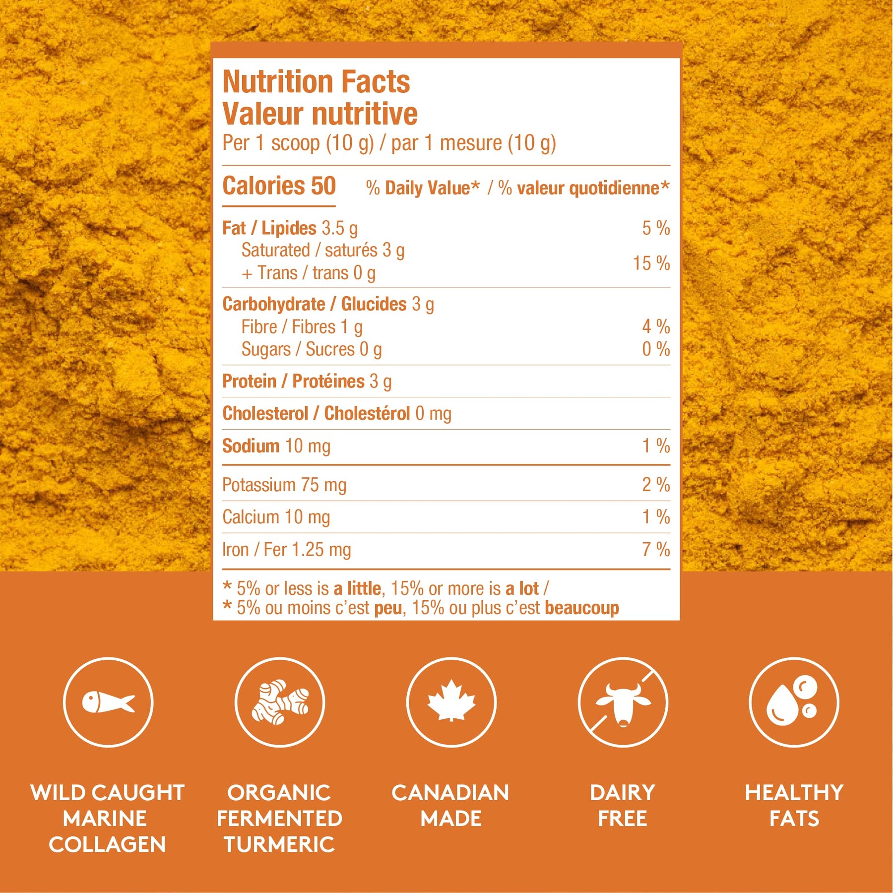 Organic coconut milk powder, Hydrolyzed marine collagen, Medium-chain triglycerides (MCT) powder (MCTs, acacia fibre), Organic fermented turmeric powder, Ginger root powder, Cinnamon powder, Cardamom powder, Black pepper. Contains: Fish (cod, pollock, haddock).