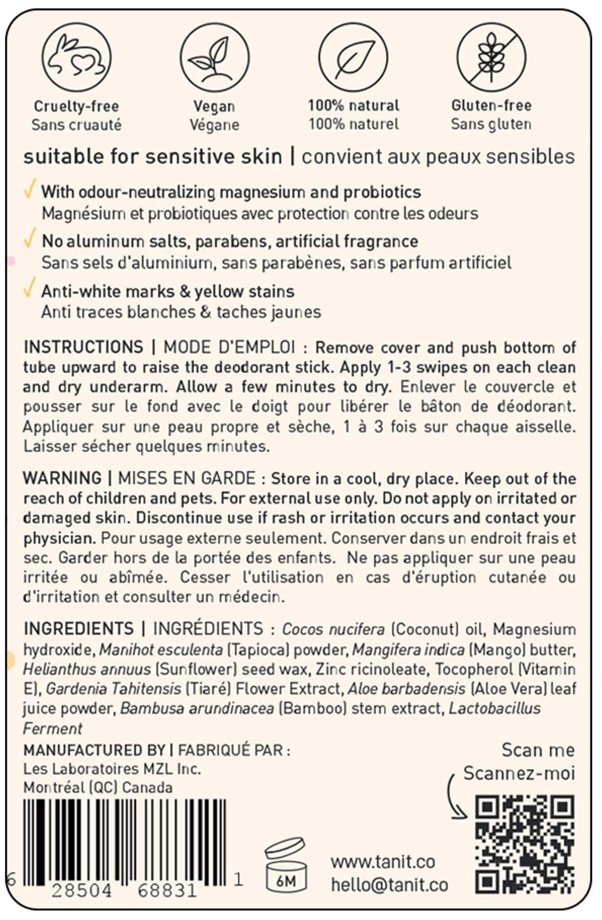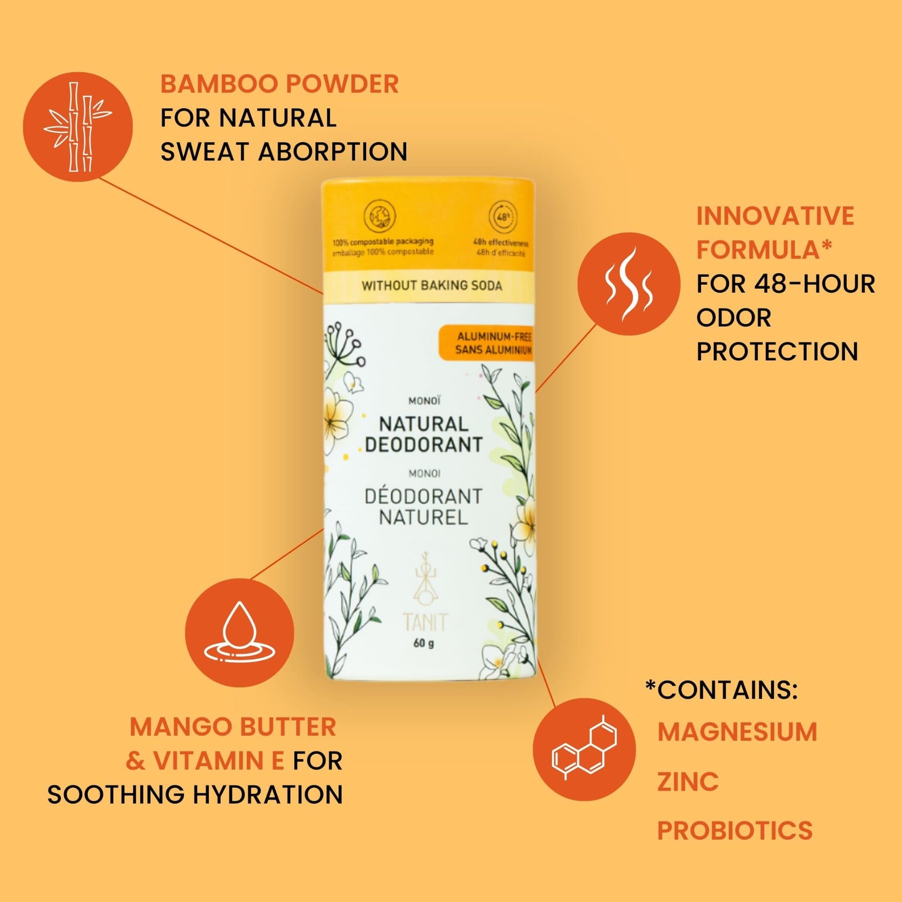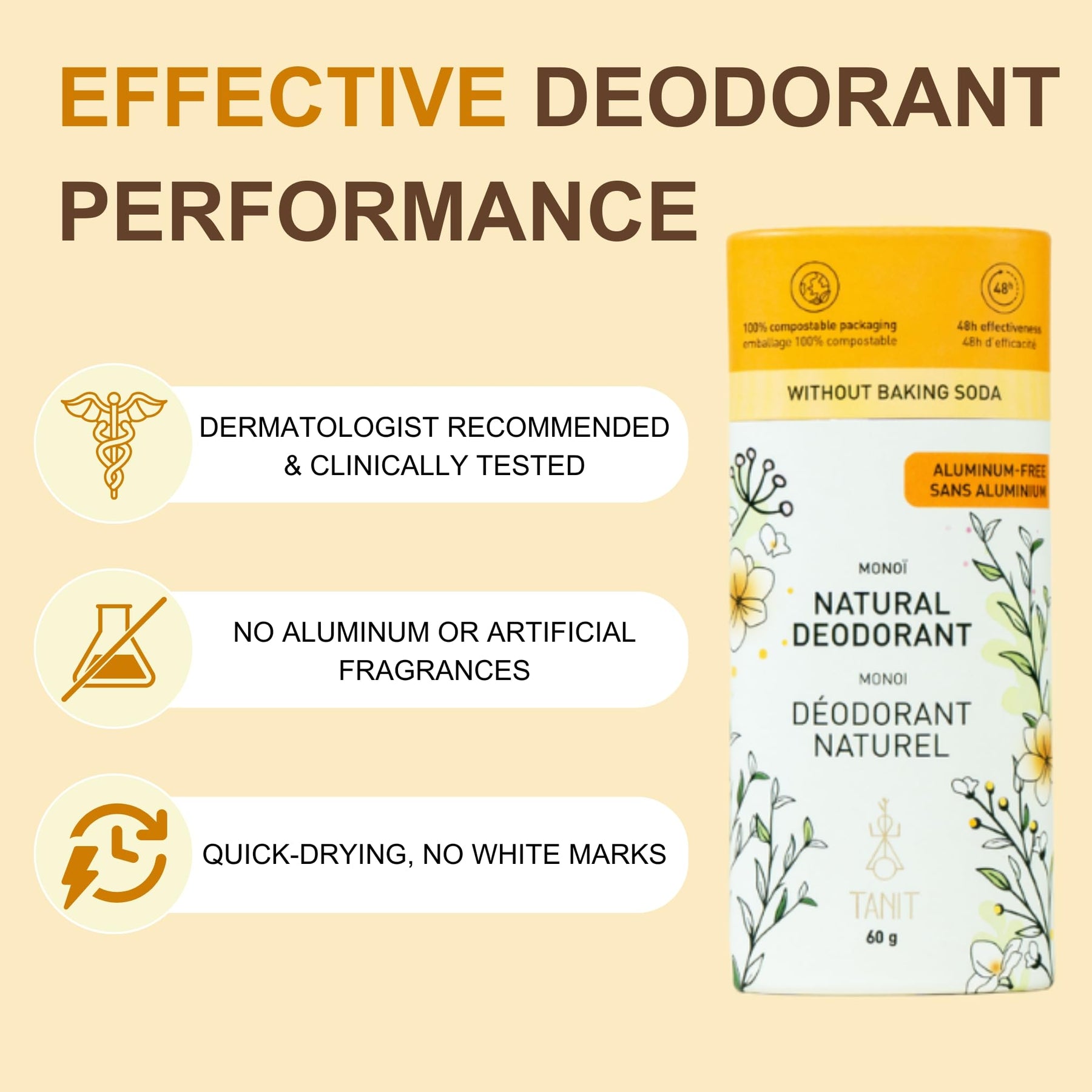 TANIT Solid Deodorant Stick Monoi Scent 60g, Long-Lasting Freshness for Women & Men, Plastic-Free & Vegan Formula, Gentle on Skin, No White Residue, Cruelty-Free, Made in Canada, 48-Hour Odour Control